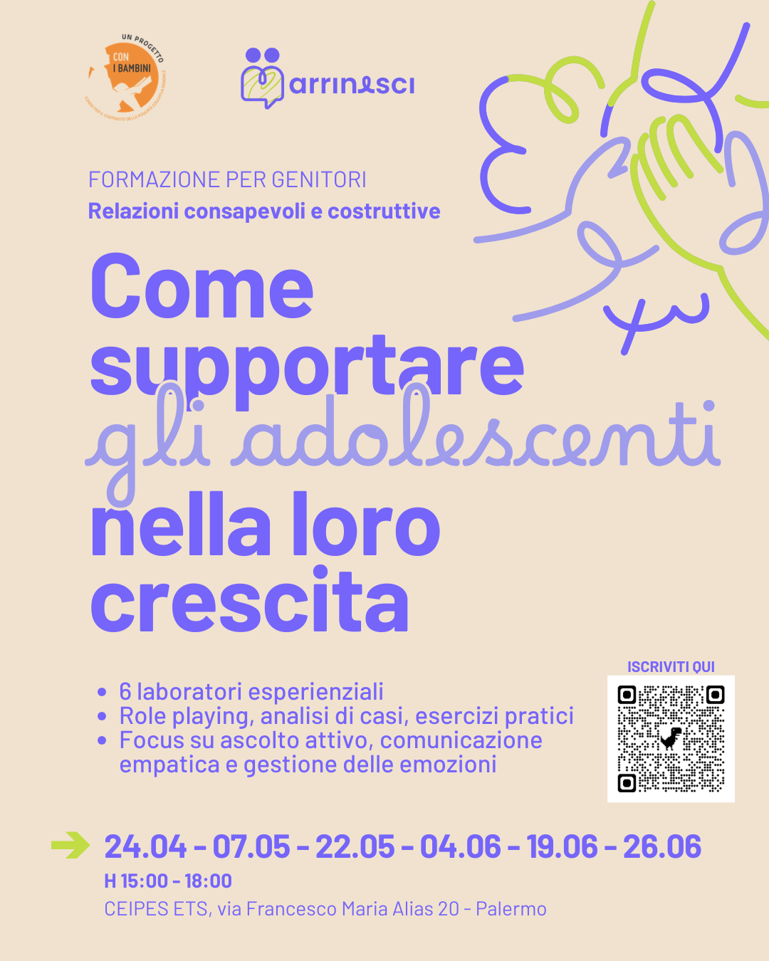 Nello specifico, il calendario prevede 6 laboratori dedicati ai genitori e 5 laboratori rivolti al corpo docente. Tutte le sessioni avranno luogo presso la sede del CEIPES ETS, sito in via Francesco Maria Alias 20.