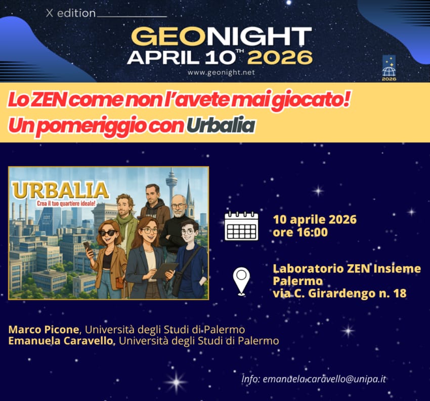 Il 10 aprile 2026, alle ore 16, in coincidenza della “GeoNight” (Notte della Geografia), presso il Laboratorio ZEN Insieme, si è svolto il laboratorio in argomento al quale hanno partecipato le alunne e gli alunni che frequentano la terza media dell’I.C.S.I.Florio/San Lorenzo di Palermo e che vivono nel suddetto quartiere. Il pomeriggio è trascorso in modo sereno e divertente. I ragazzi hanno avuto modo di conoscere il gioco da tavola Urbalia, hanno creato il loro quartiere ideale, utilizzando il tabellone che rappresenta una porzione di territorio (in questo caso ispirato allo ZEN di Palermo). Al termine una delle ragazze è stata intervistata in lingua inglese. I ragazzi sono andati via contenti, ringraziando i docenti Marco Picone ed Emanuela Caravello per aver dato loro questa opportunità di svago e condivisione.